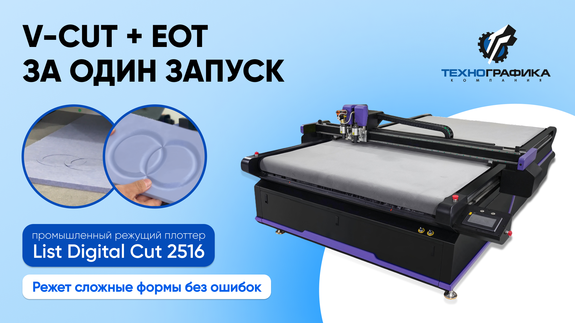 Показываем работу промышленного режущего плоттера List Digital Cut 2516 с двумя инструментами: для V-образной выборки и осциллирующей резки.